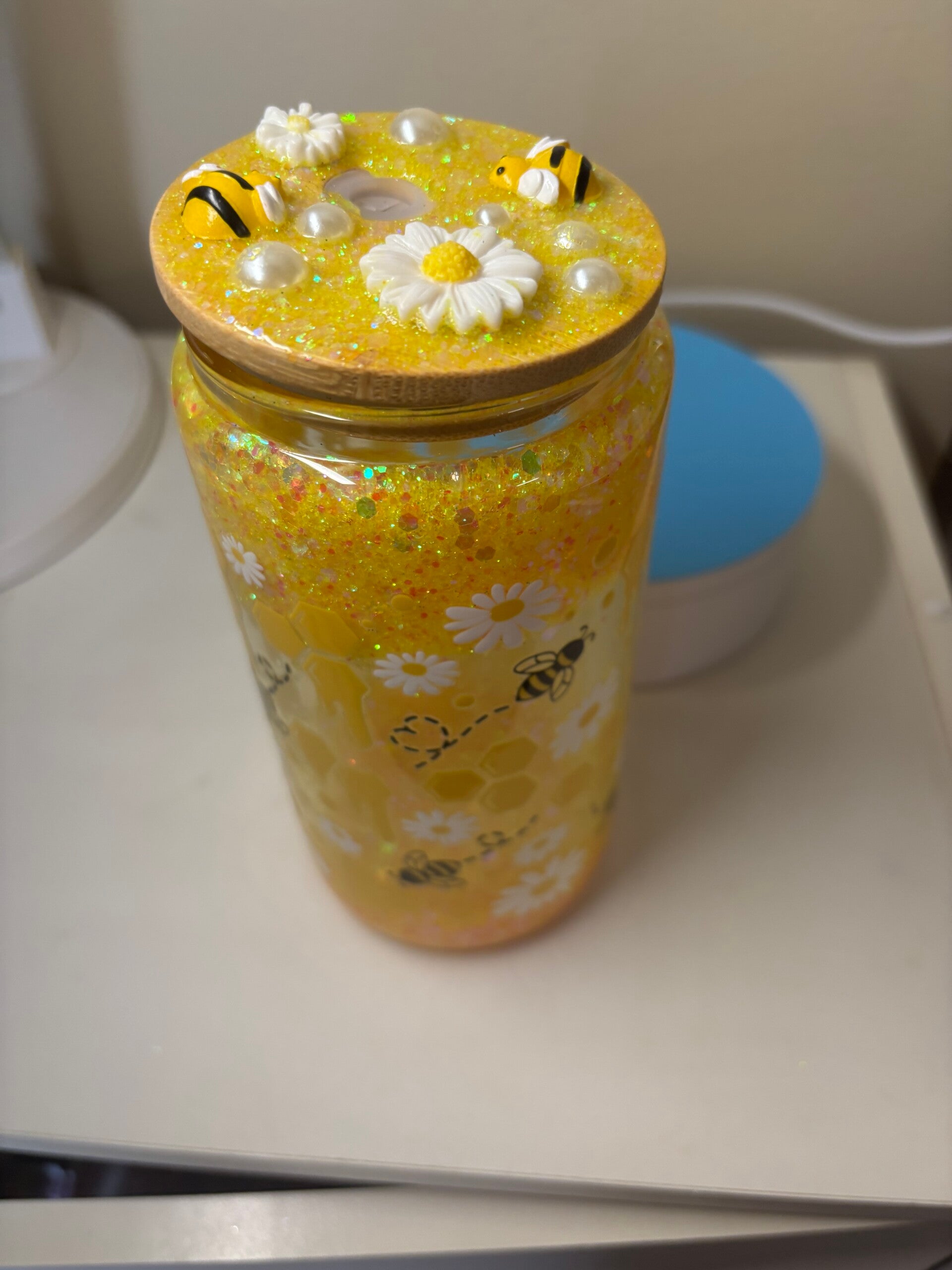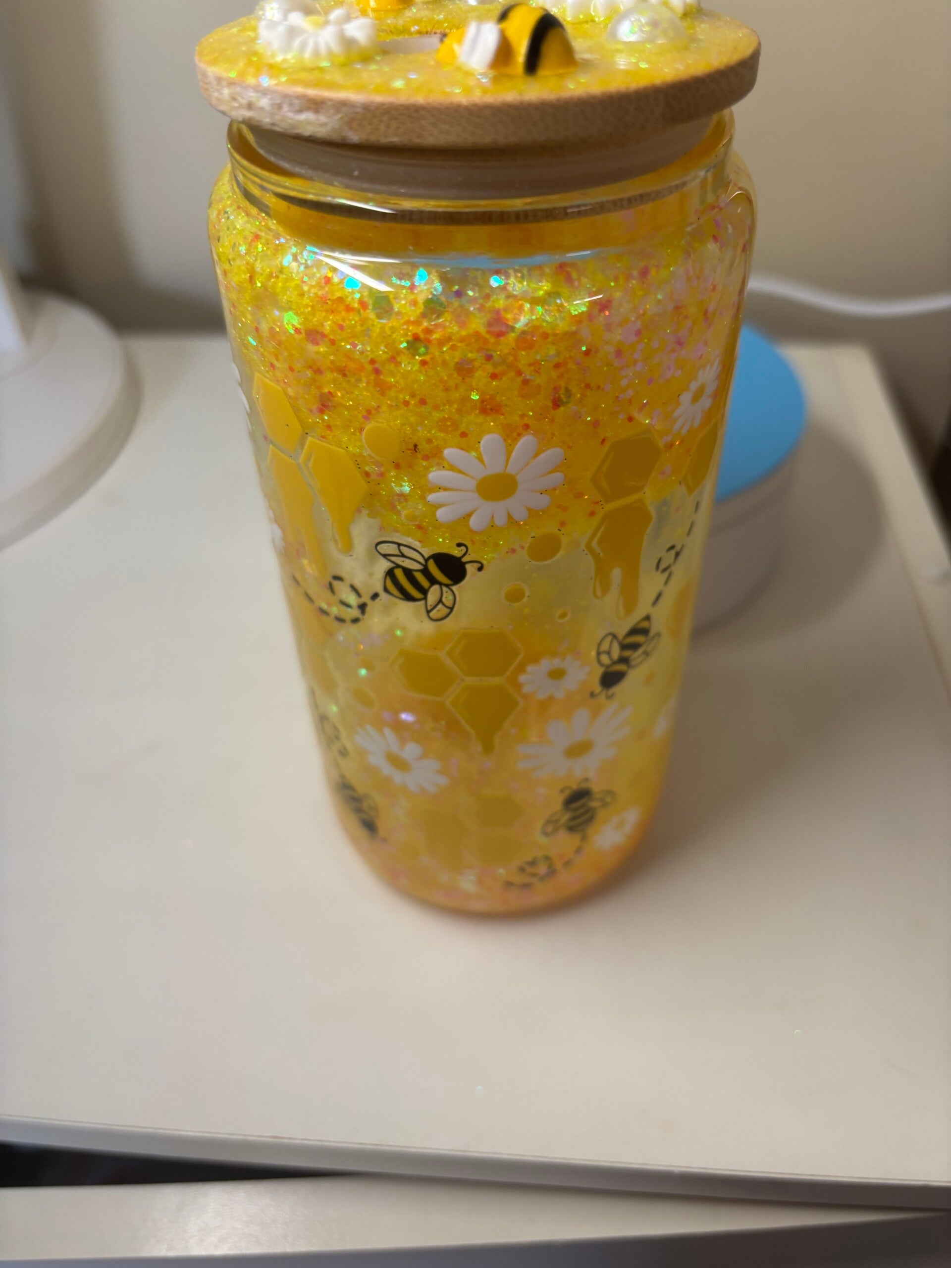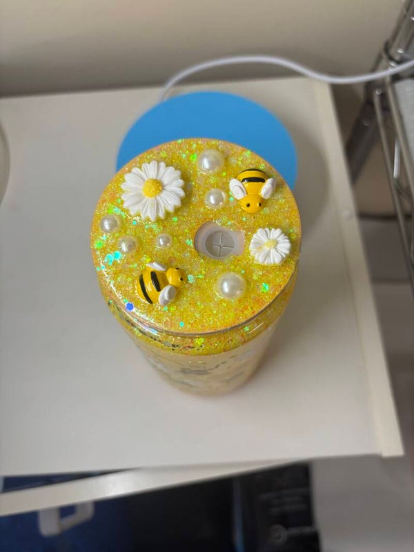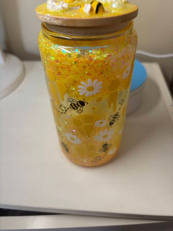 This is such a cute snow globe tumbler has bumble bees and ho eycombs on cup. Lid is decorated with honey jar and bees. Come with a lid and straw. Handwash to make the outside stay bright.