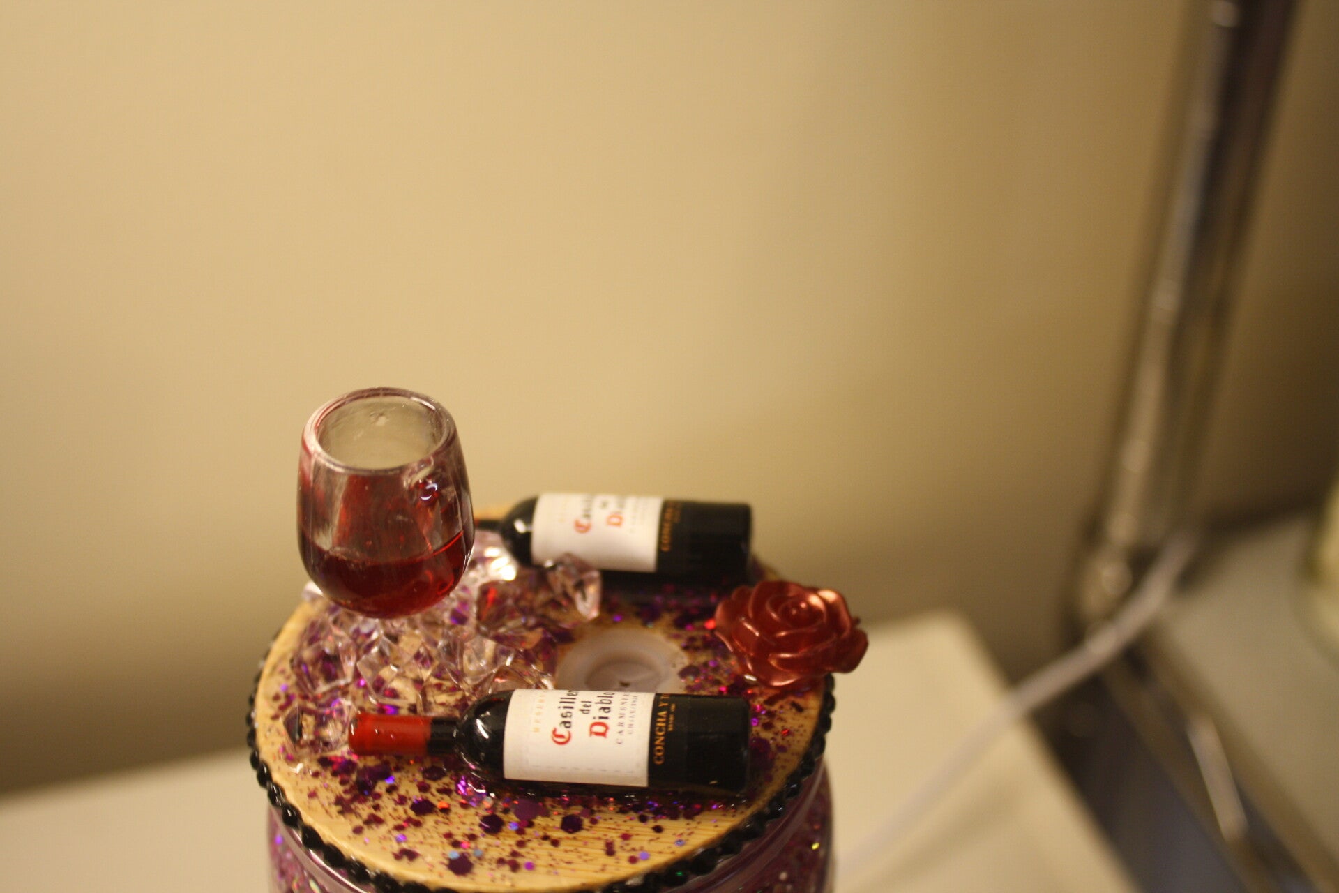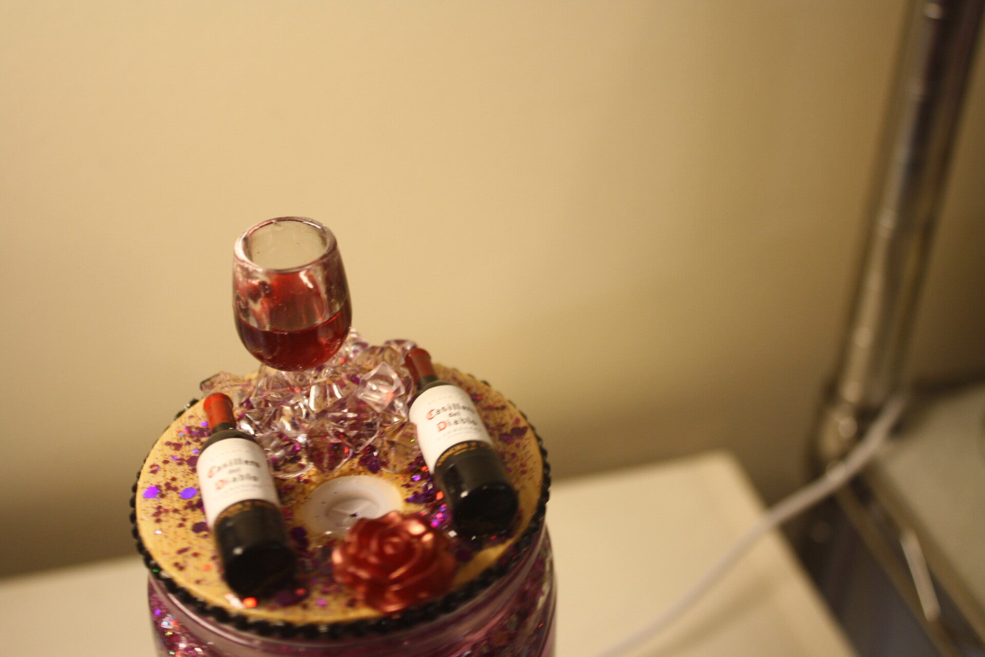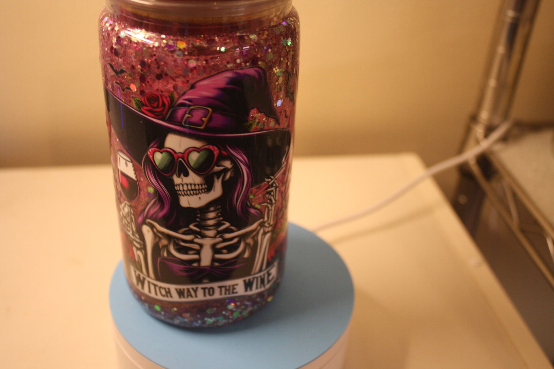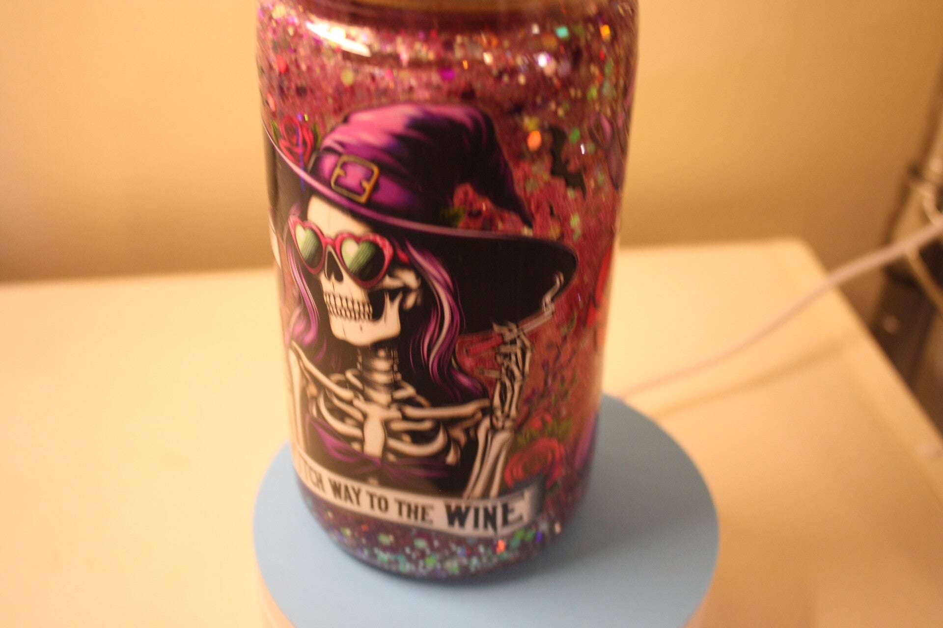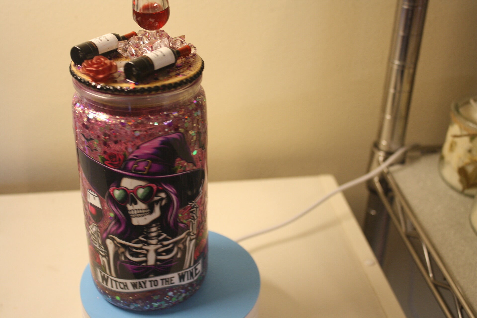 This is a really cute witch with a topper with a wine glass and bottles of wine. The color is rose and silver to match the UV wrap. Makes a great gift for that person who loves spooky and fun at the same time.